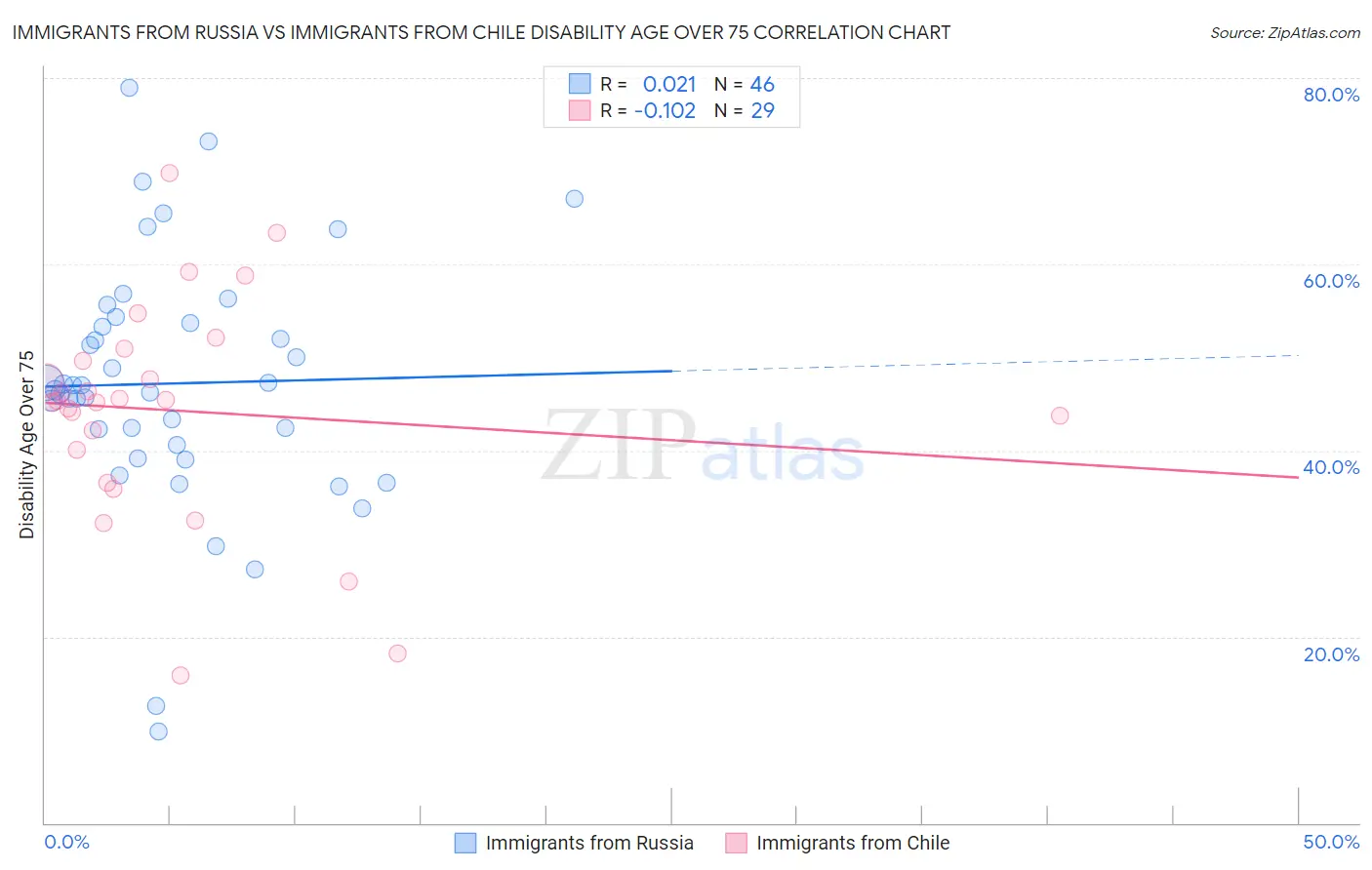 Immigrants from Russia vs Immigrants from Chile Disability Age Over 75 Correlation Chart