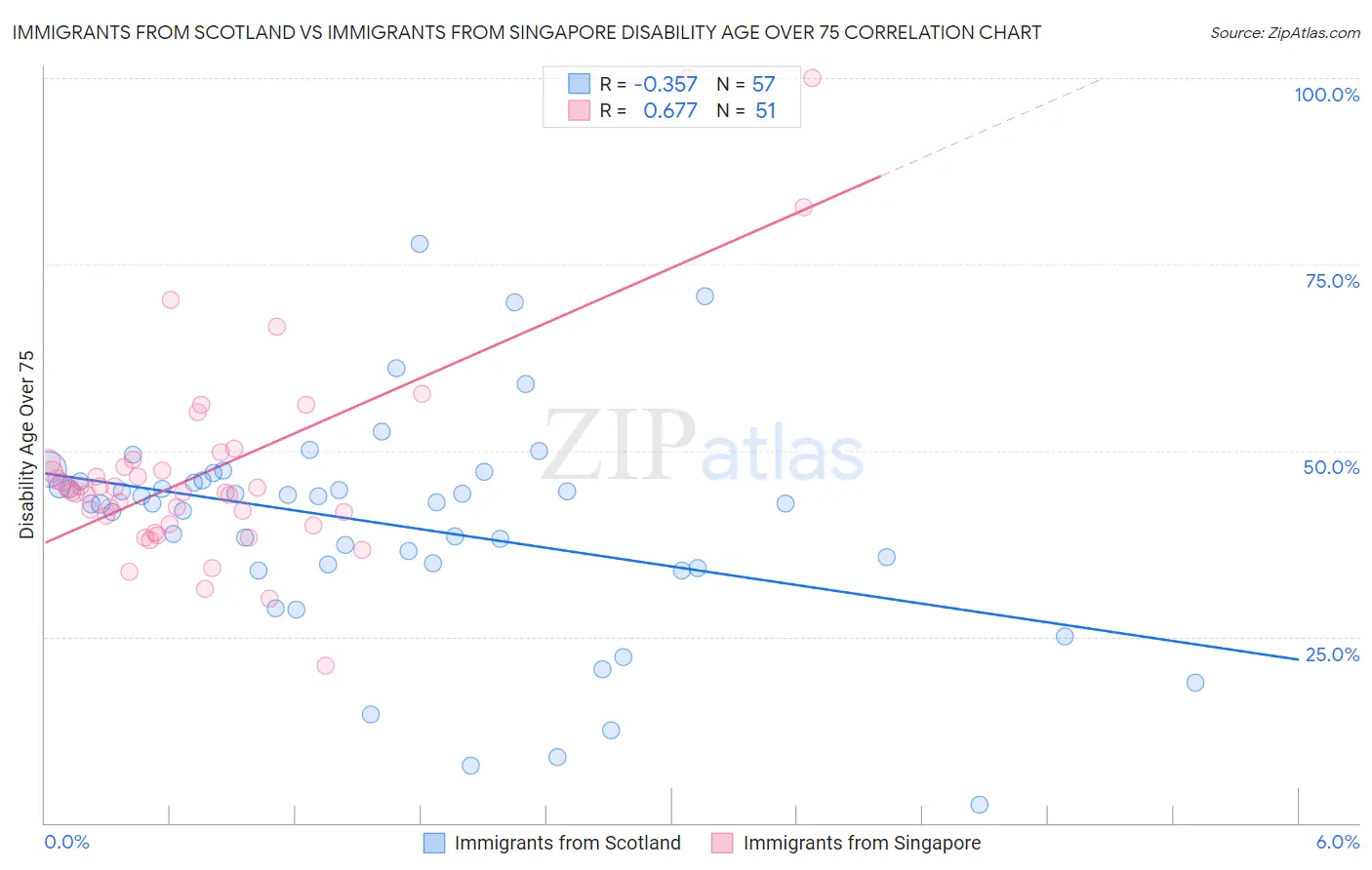 Immigrants from Scotland vs Immigrants from Singapore Disability Age Over 75 Correlation Chart