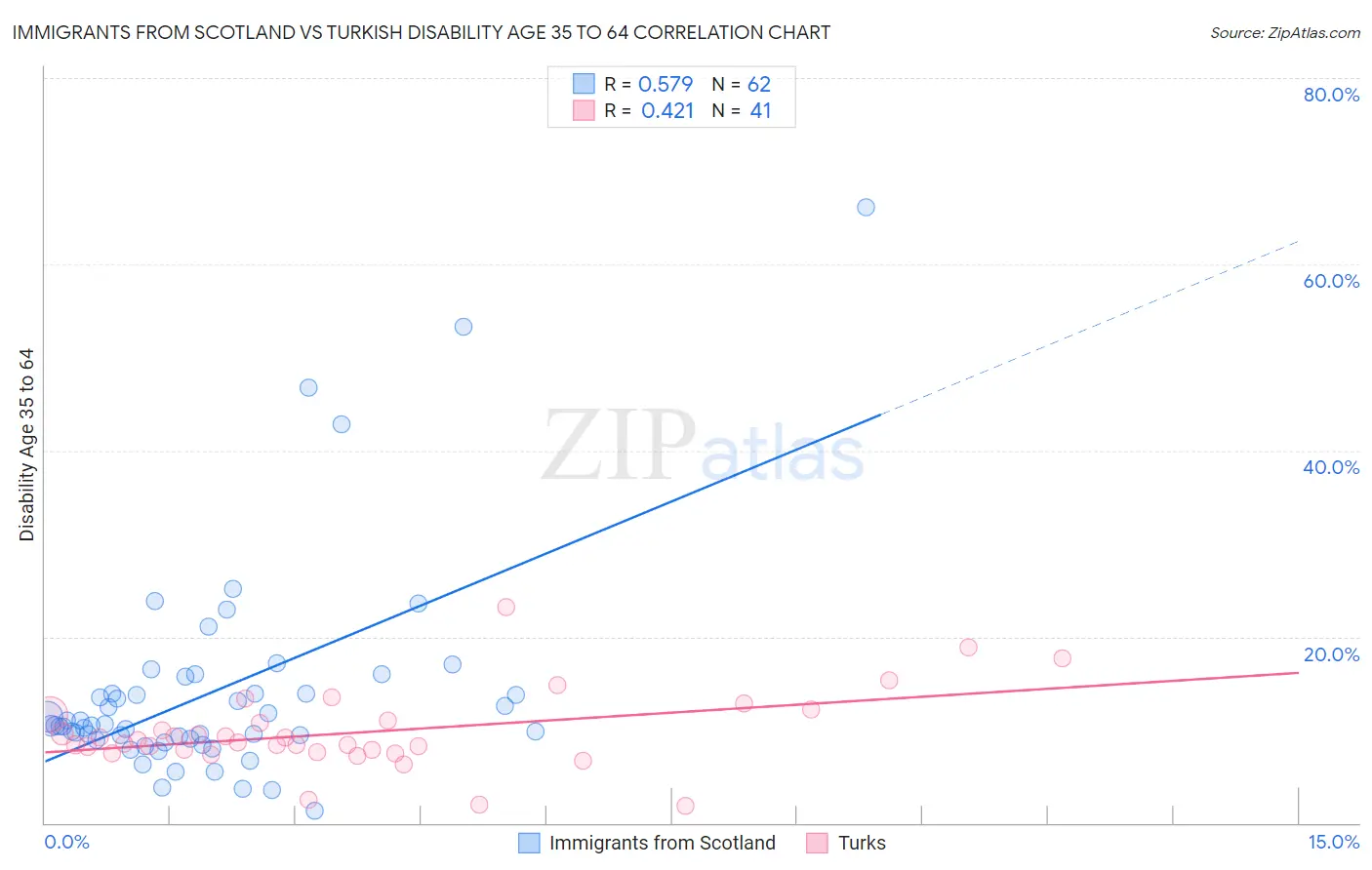 Immigrants from Scotland vs Turkish Disability Age 35 to 64 Correlation Chart