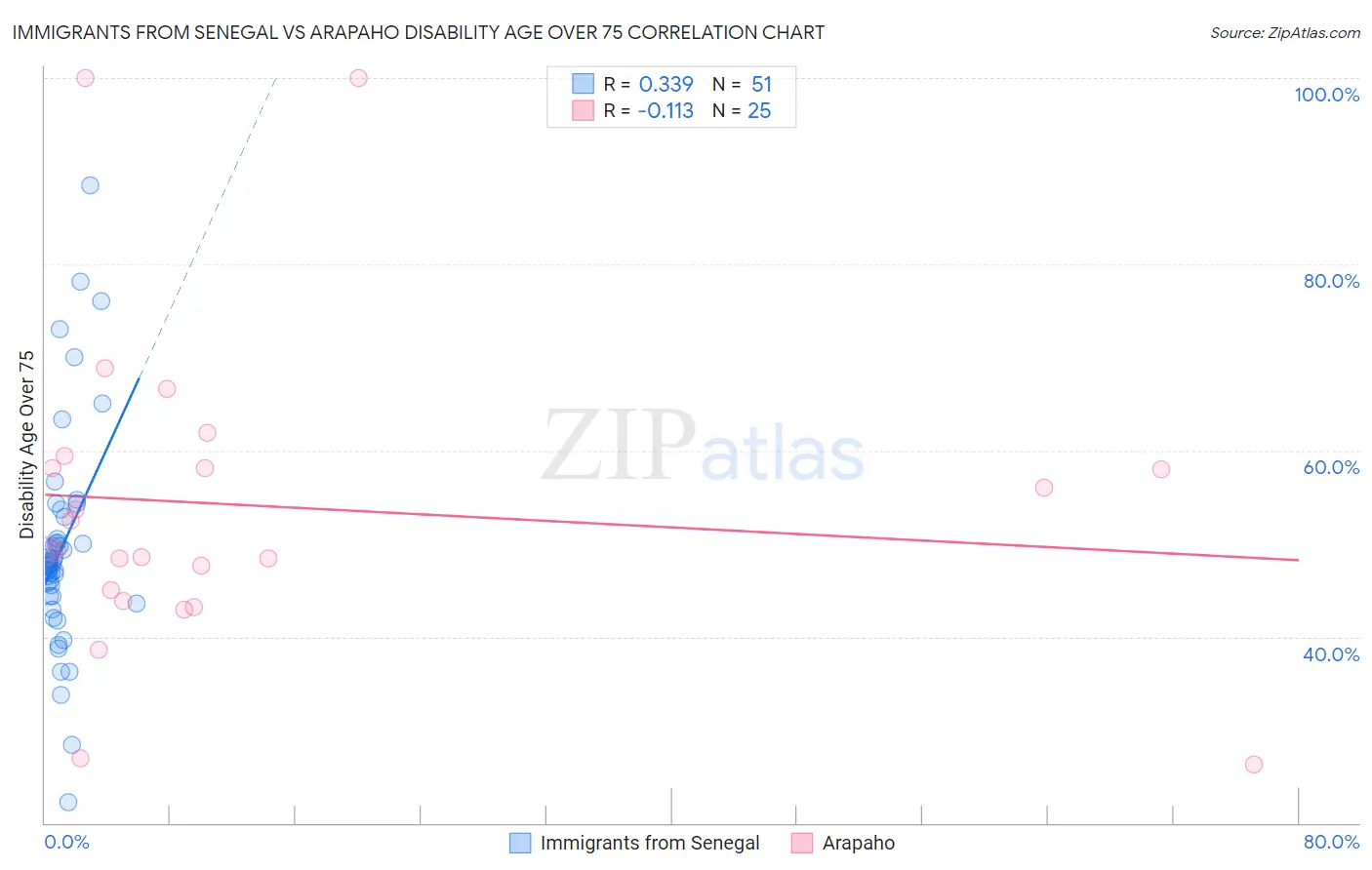 Immigrants from Senegal vs Arapaho Disability Age Over 75 Correlation Chart