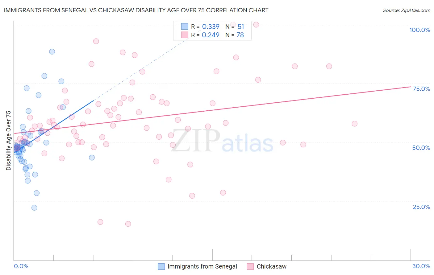 Immigrants from Senegal vs Chickasaw Disability Age Over 75 Correlation Chart