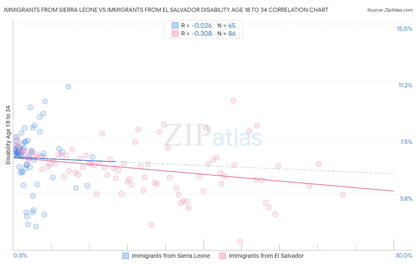Immigrants from Sierra Leone vs Immigrants from El Salvador Disability Age 18 to 34 Correlation Chart