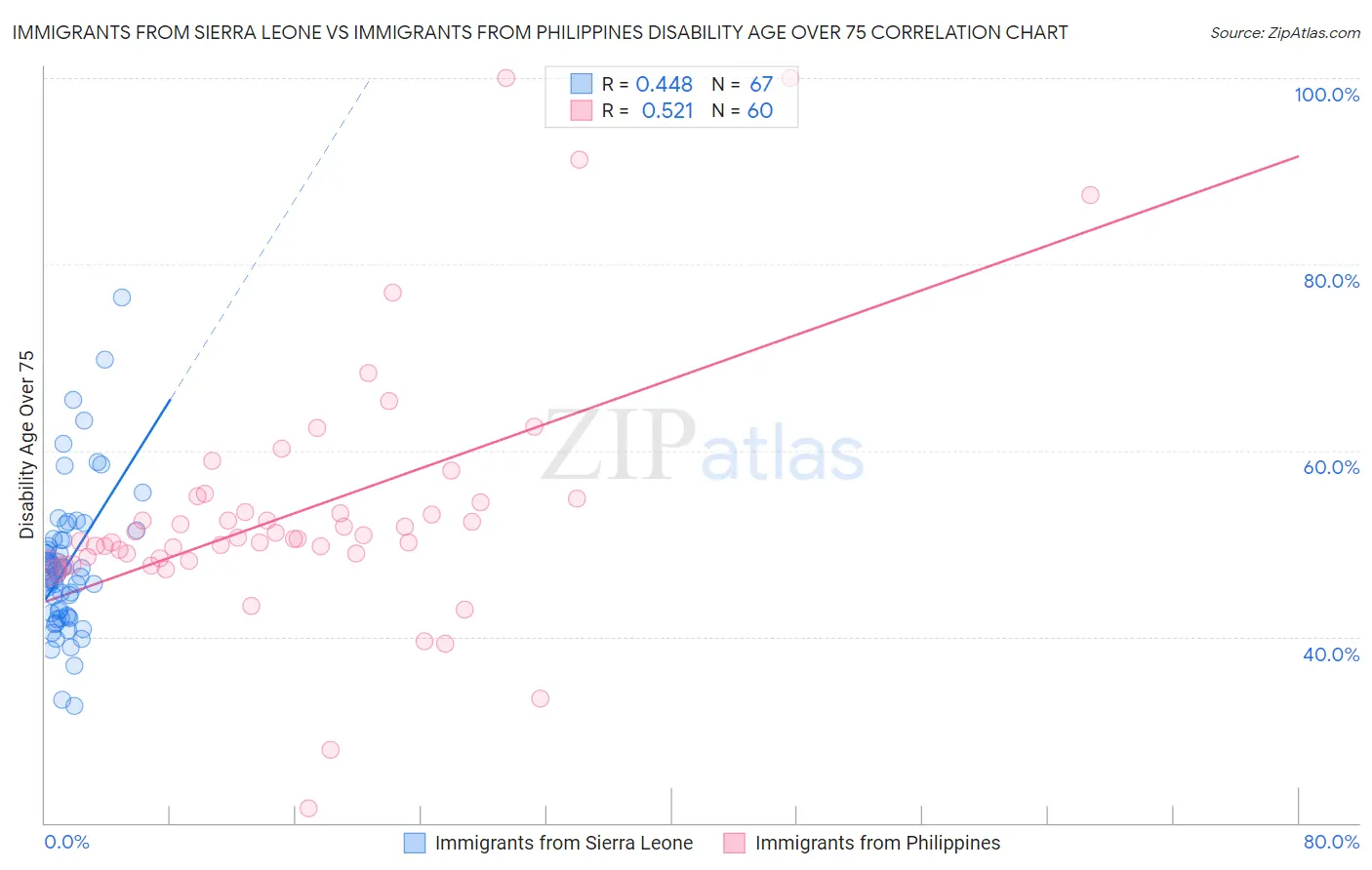 Immigrants from Sierra Leone vs Immigrants from Philippines Disability Age Over 75 Correlation Chart