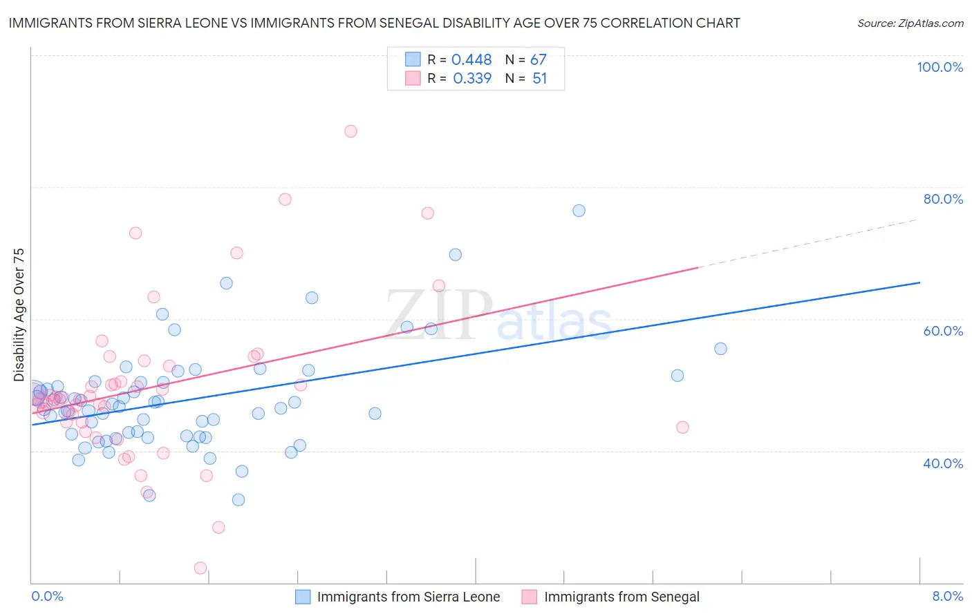 Immigrants from Sierra Leone vs Immigrants from Senegal Disability Age Over 75 Correlation Chart