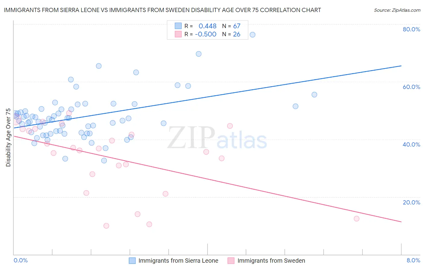 Immigrants from Sierra Leone vs Immigrants from Sweden Disability Age Over 75 Correlation Chart