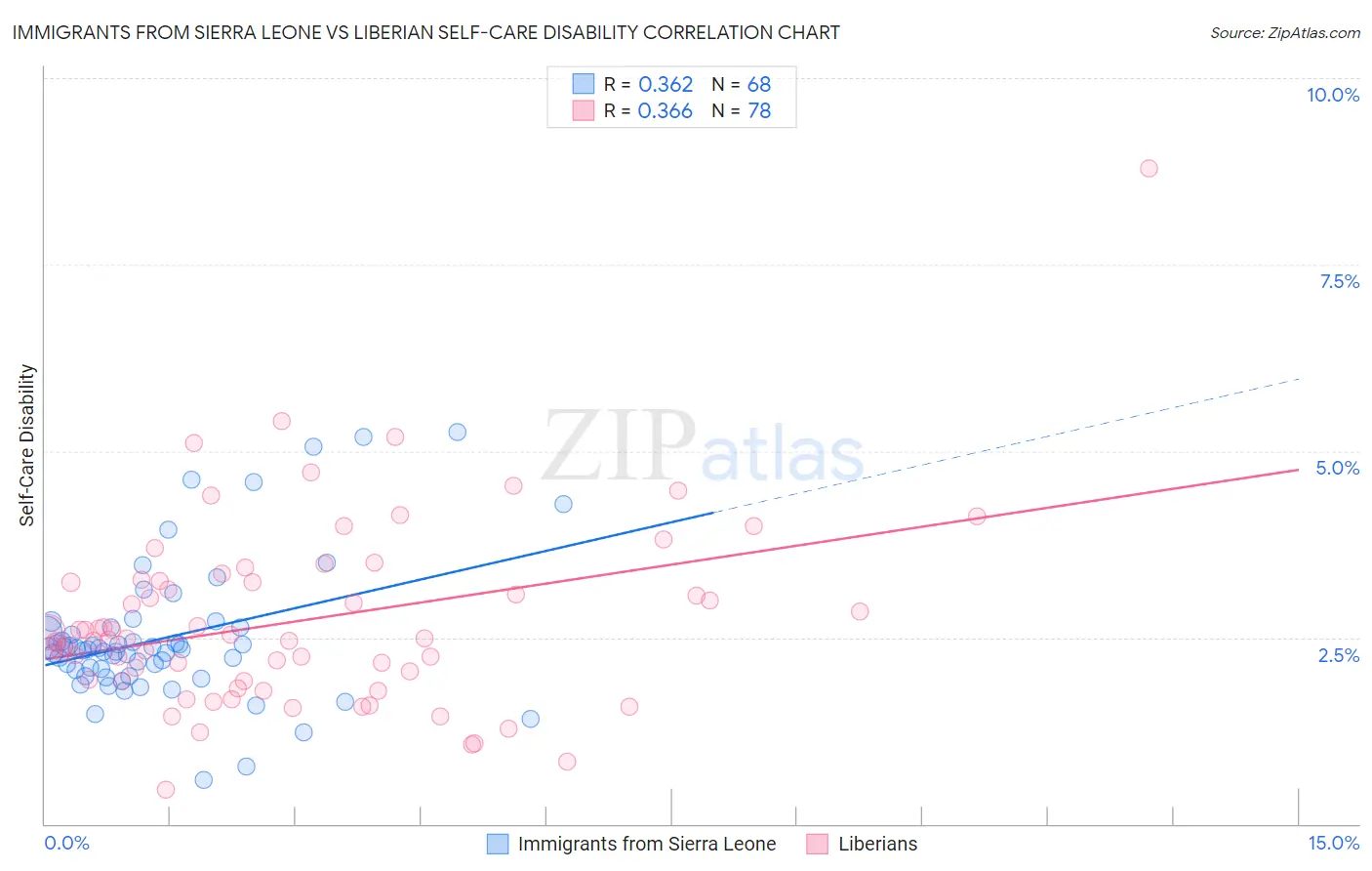 The statistical analysis conducted on geographies consisting of 101,626,227 people shows a mild positive correlation between the proportion of Immigrants from Sierra Leone and percentage of population with self-care disability in the United States with a correlation coefficient (R) of 0.362 and weighted average of 2.4%. Similarly, the statistical analysis conducted on geographies consisting of 117,995,885 people shows a mild positive correlation between the proportion of Liberians and percentage of population with self-care disability in the United States with a correlation coefficient (R) of 0.366 and weighted average of 2.6%, a difference of 7.7%.