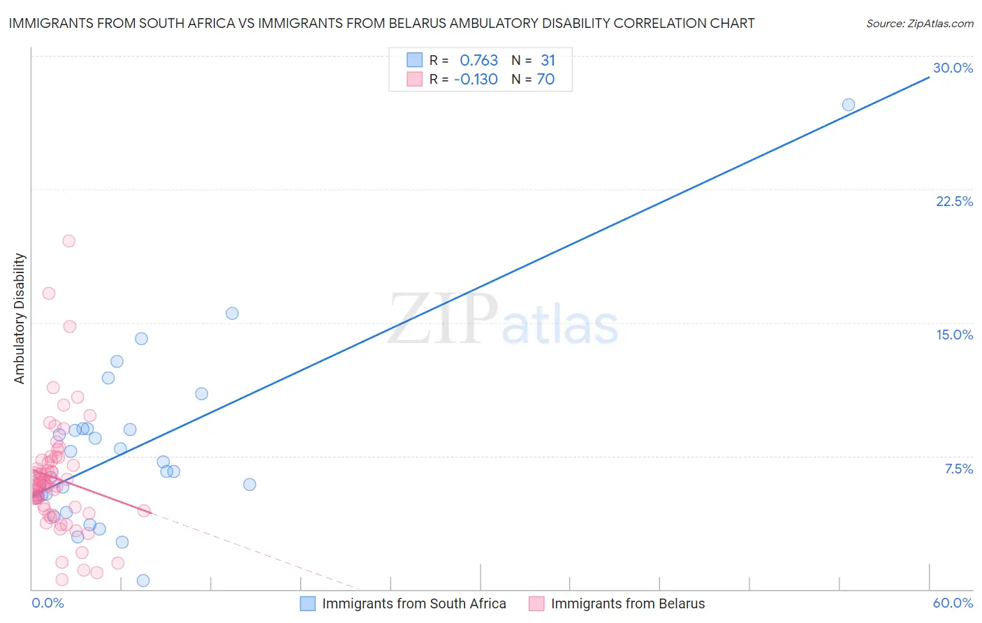 Immigrants from South Africa vs Immigrants from Belarus Ambulatory Disability Correlation Chart