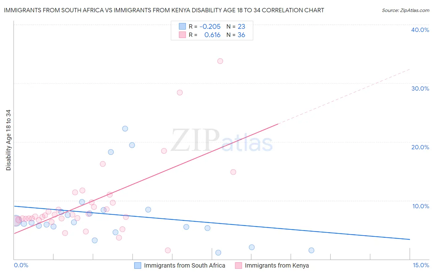 Immigrants from South Africa vs Immigrants from Kenya Disability Age 18 to 34 Correlation Chart