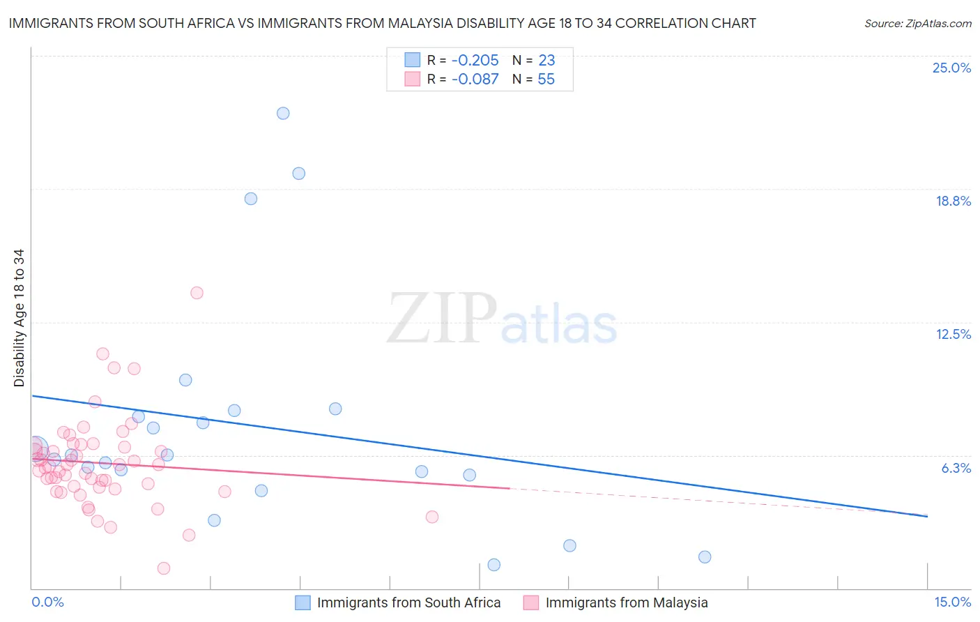 Immigrants from South Africa vs Immigrants from Malaysia Disability Age 18 to 34