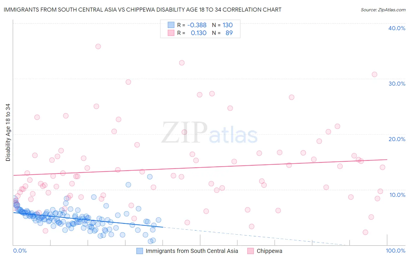 Immigrants from South Central Asia vs Chippewa Disability Age 18 to 34 Correlation Chart