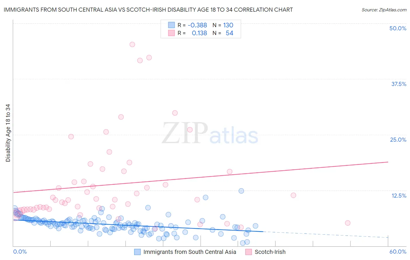 Immigrants from South Central Asia vs Scotch-Irish Disability Age 18 to 34 Correlation Chart