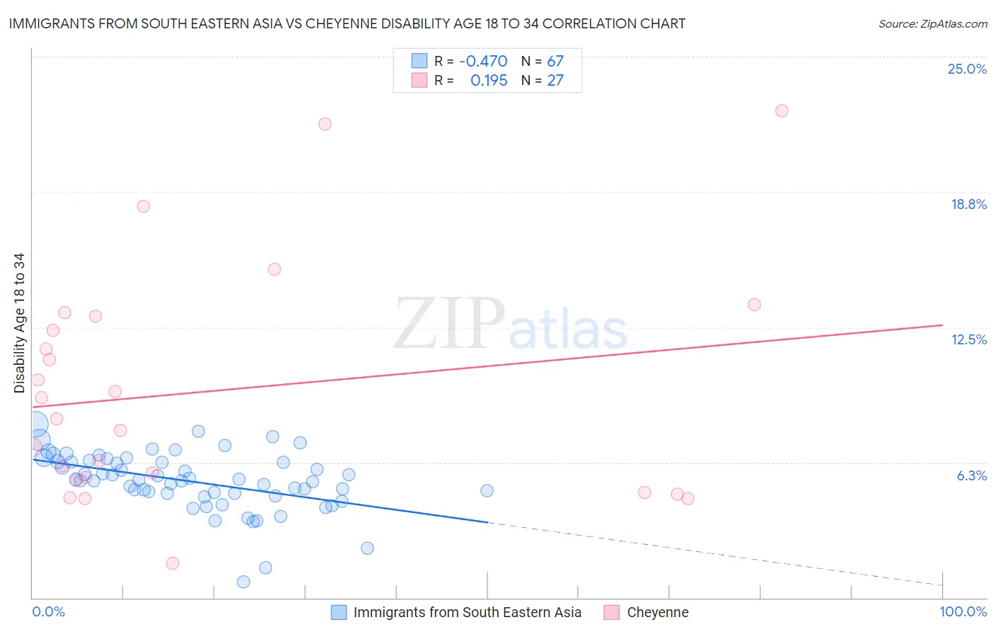 Immigrants from South Eastern Asia vs Cheyenne Disability Age 18 to 34 Correlation Chart