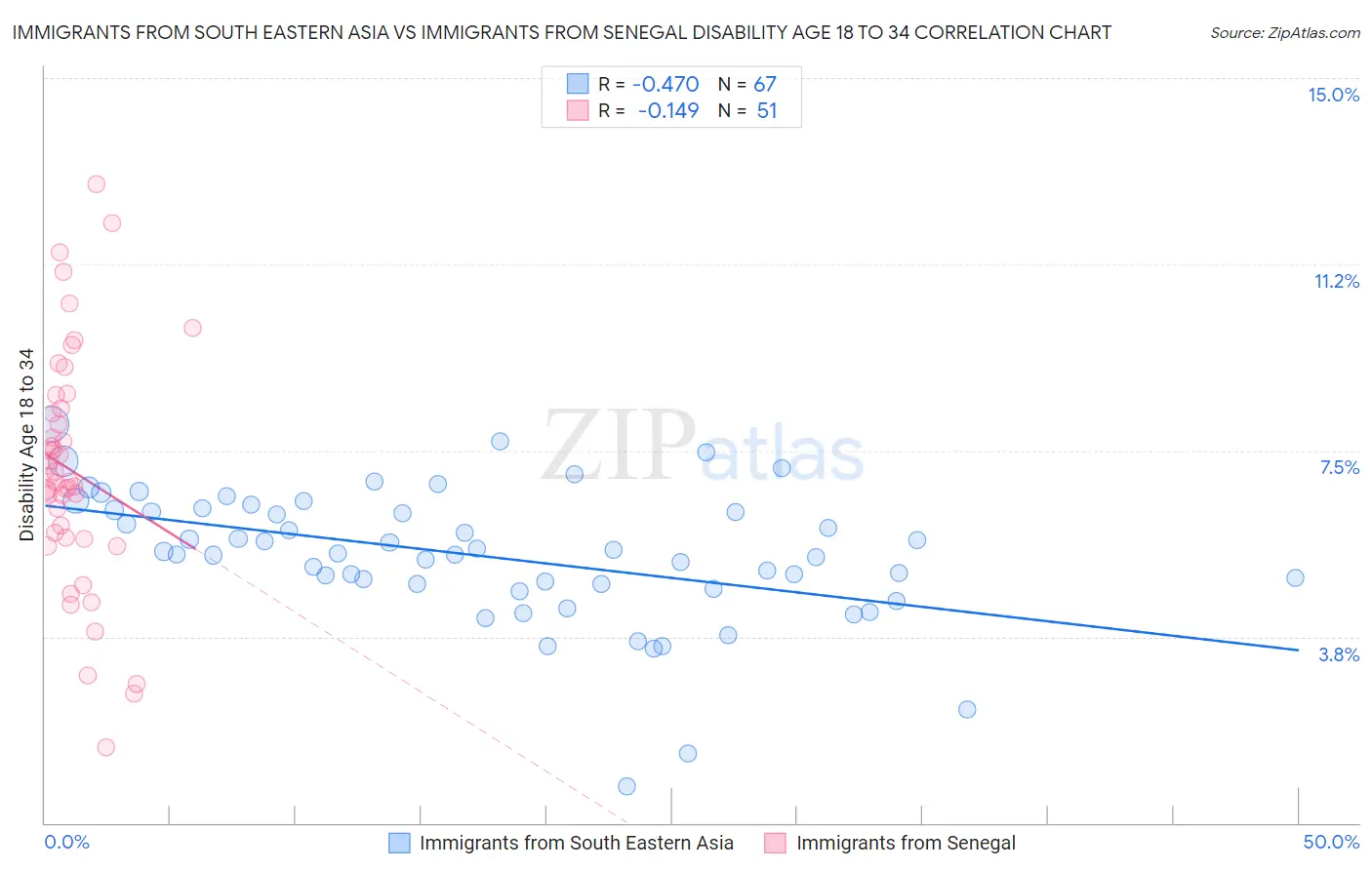 Immigrants from South Eastern Asia vs Immigrants from Senegal Disability Age 18 to 34 Correlation Chart