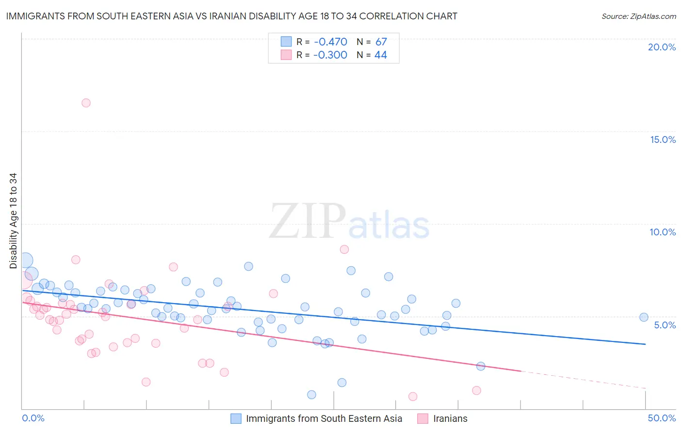 Immigrants from South Eastern Asia vs Iranian Disability Age 18 to 34 Correlation Chart