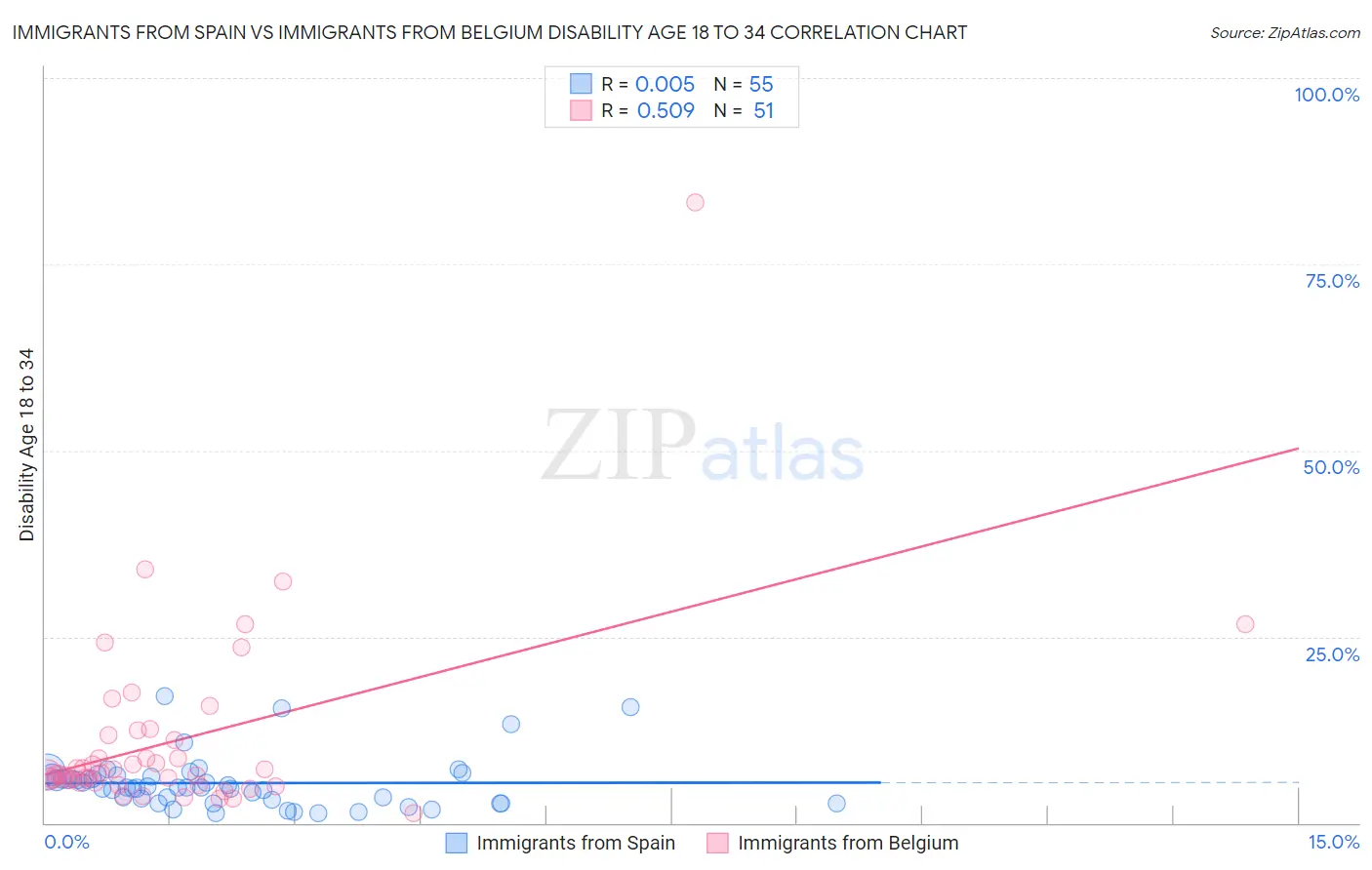 Immigrants from Spain vs Immigrants from Belgium Disability Age 18 to 34 Correlation Chart