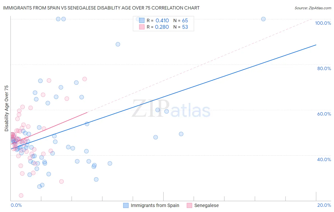 Immigrants from Spain vs Senegalese Disability Age Over 75 Correlation Chart