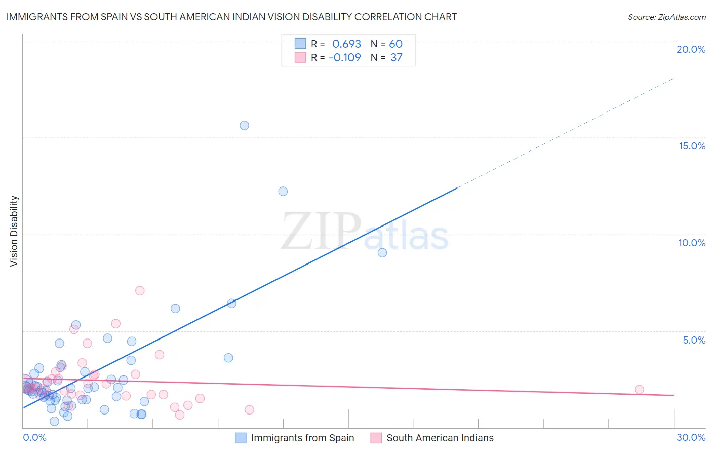 Immigrants from Spain vs South American Indian Vision Disability Correlation Chart