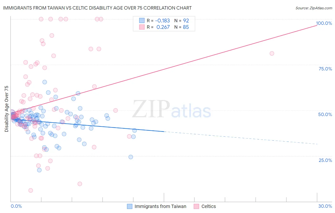 Immigrants from Taiwan vs Celtic Disability Age Over 75 Correlation Chart