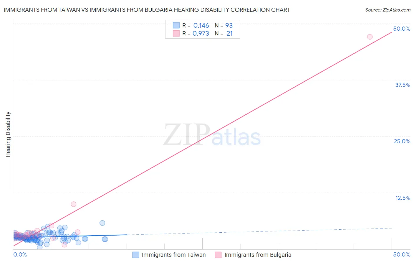 Immigrants from Taiwan vs Immigrants from Bulgaria Hearing Disability Correlation Chart