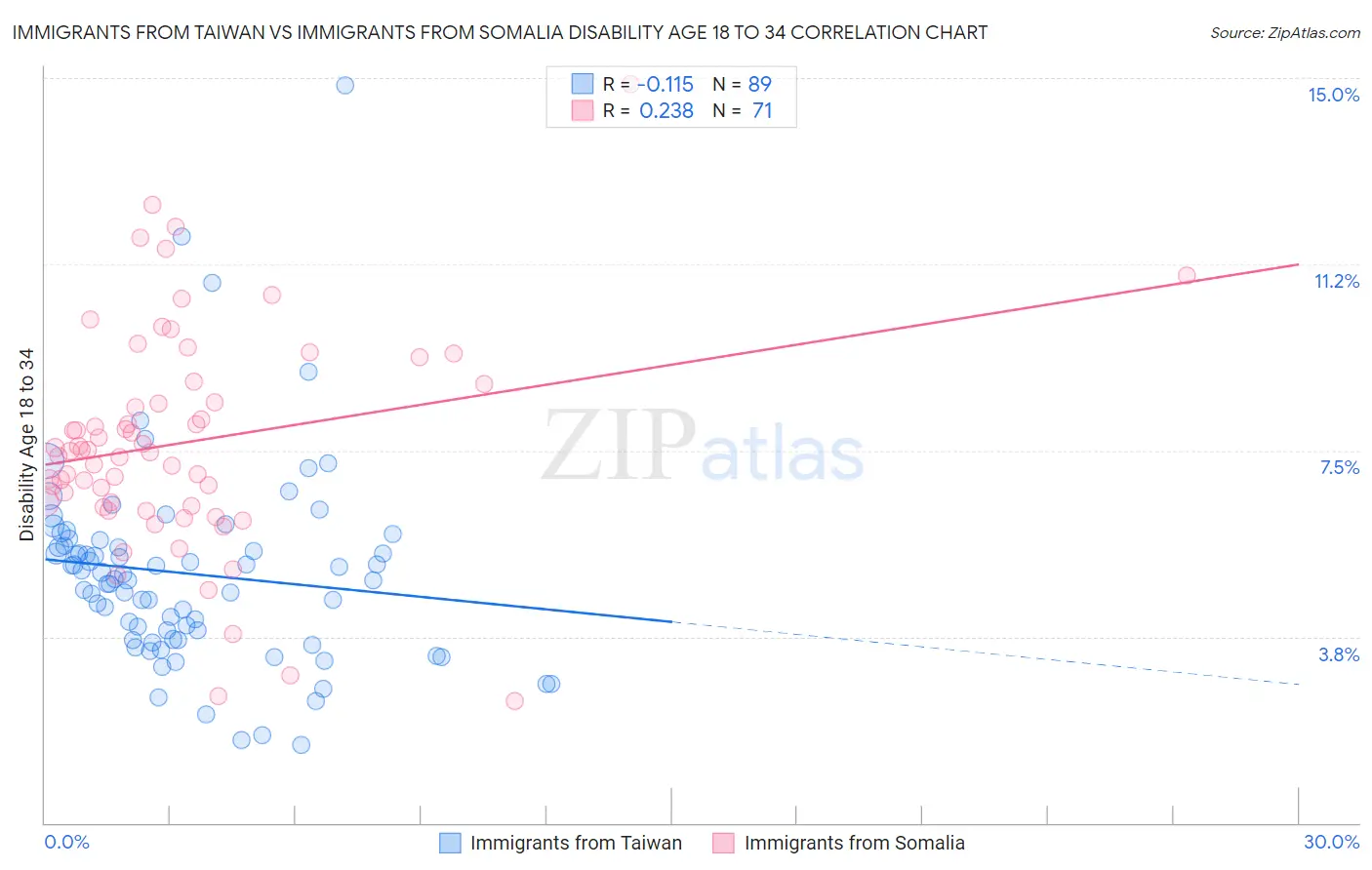 Immigrants from Taiwan vs Immigrants from Somalia Disability Age 18 to 34 Correlation Chart