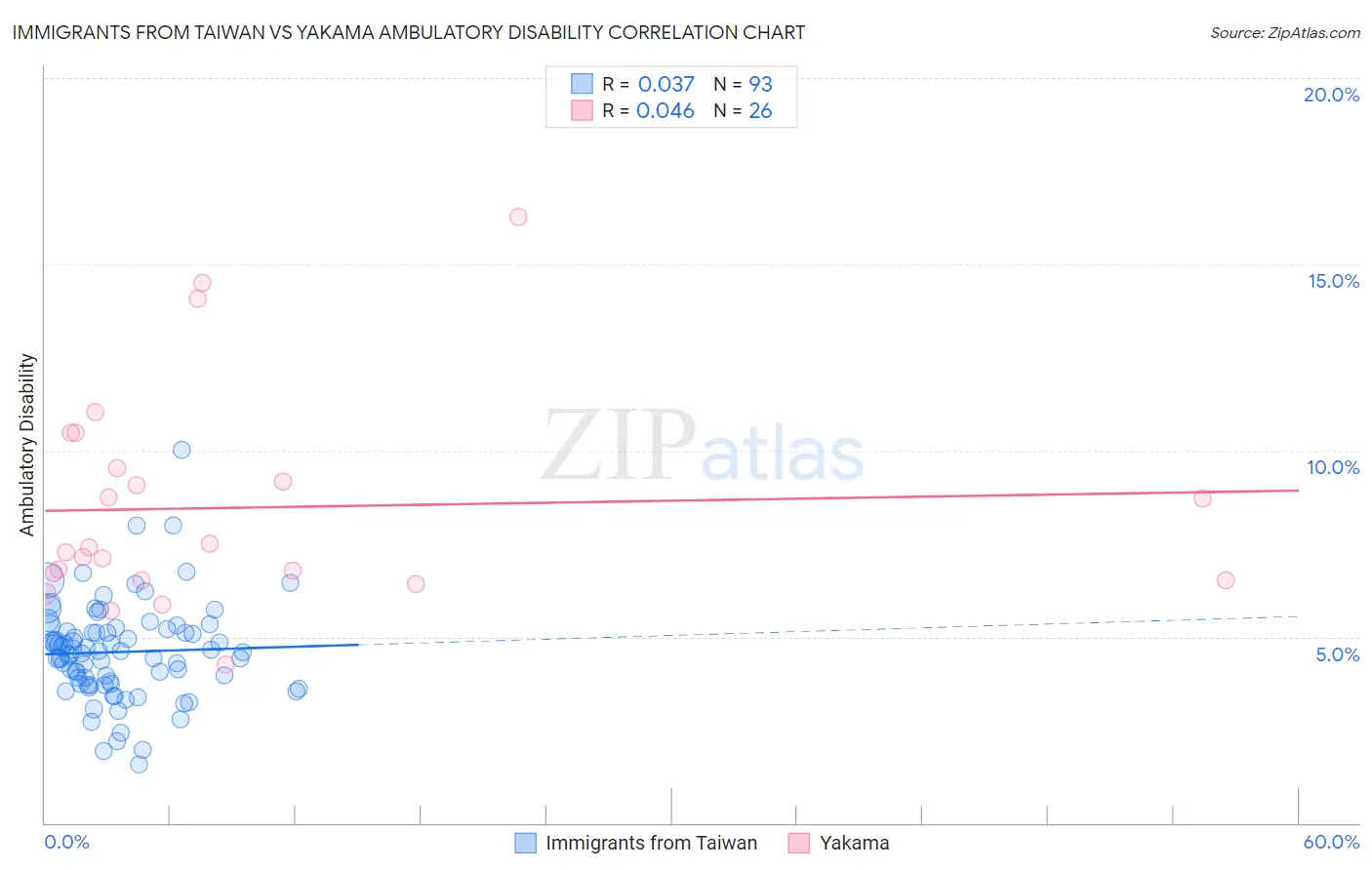 Immigrants from Taiwan vs Yakama Ambulatory Disability Correlation Chart