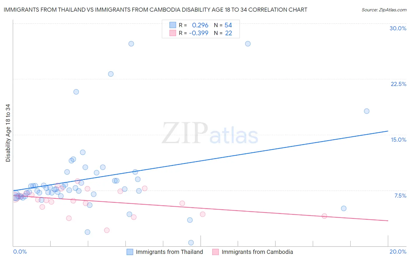 Immigrants from Thailand vs Immigrants from Cambodia Disability Age 18 to 34 Correlation Chart