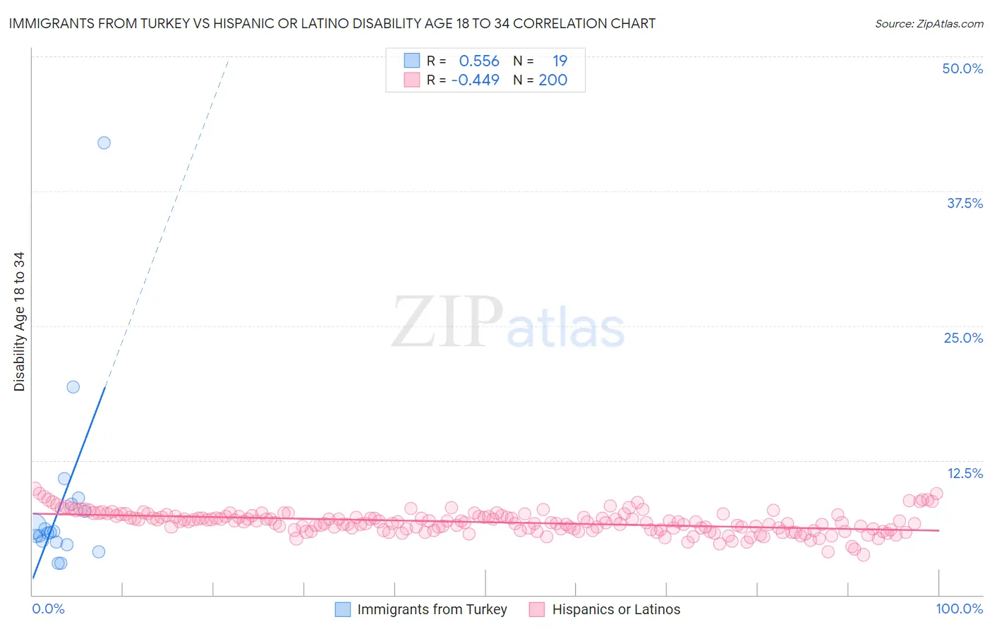 Immigrants from Turkey vs Hispanic or Latino Disability Age 18 to 34 Correlation Chart