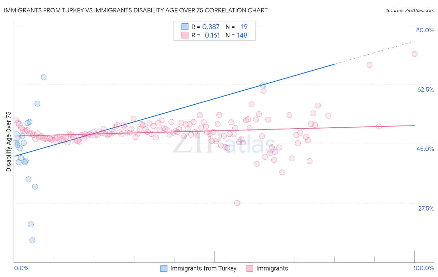 Immigrants from Turkey vs Immigrants Disability Age Over 75 Correlation Chart