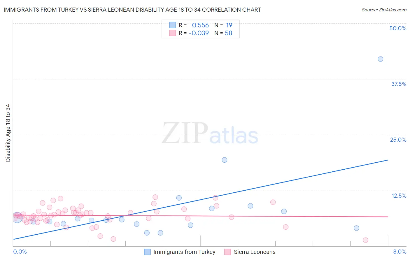 Immigrants from Turkey vs Sierra Leonean Disability Age 18 to 34 Correlation Chart