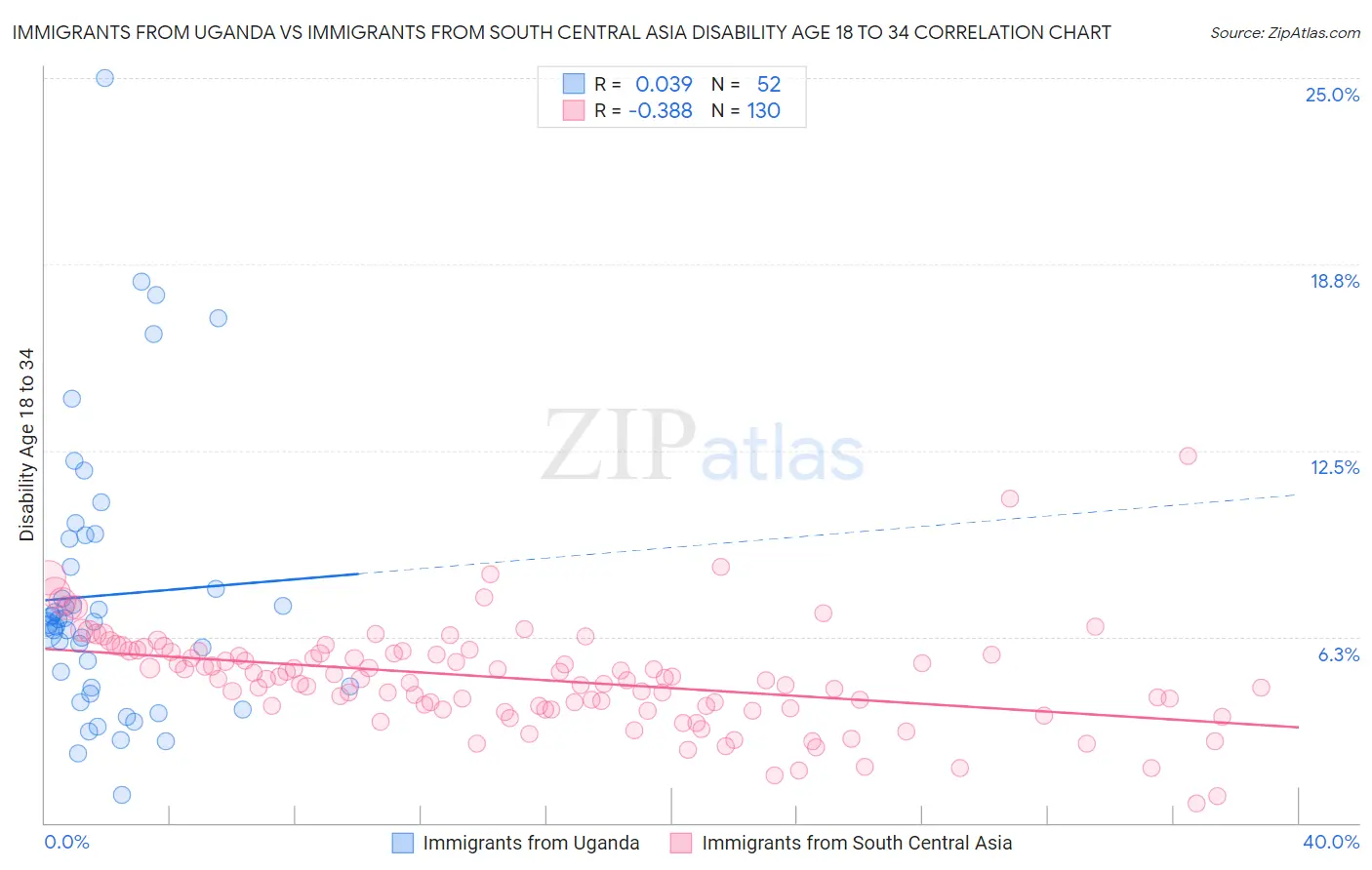 Immigrants from Uganda vs Immigrants from South Central Asia Disability Age 18 to 34 Correlation Chart