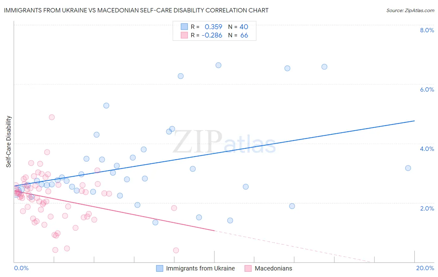 The statistical analysis conducted on geographies consisting of 289,474,241 people shows a mild positive correlation between the proportion of Immigrants from Ukraine and percentage of population with self-care disability in the United States with a correlation coefficient (R) of 0.359 and weighted average of 2.7%. Similarly, the statistical analysis conducted on geographies consisting of 132,583,440 people shows a weak negative correlation between the proportion of Macedonians and percentage of population with self-care disability in the United States with a correlation coefficient (R) of -0.286 and weighted average of 2.4%, a difference of 13.4%.