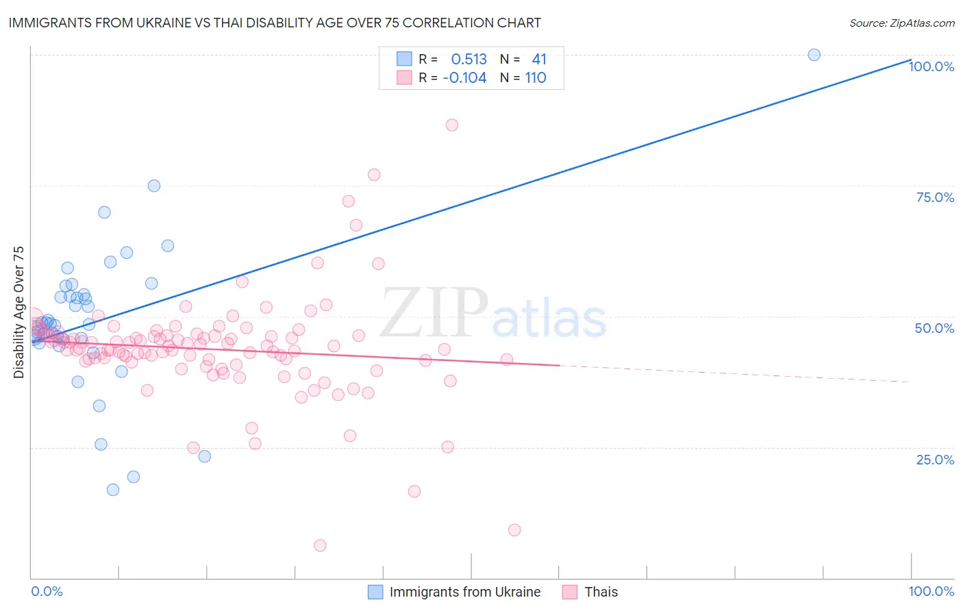 Immigrants from Ukraine vs Thai Disability Age Over 75 Correlation Chart