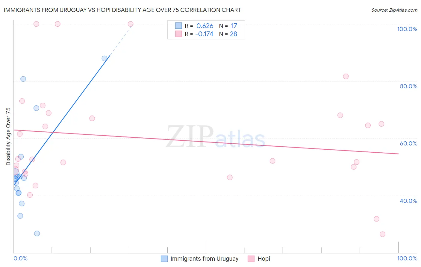 Immigrants from Uruguay vs Hopi Disability Age Over 75 Correlation Chart