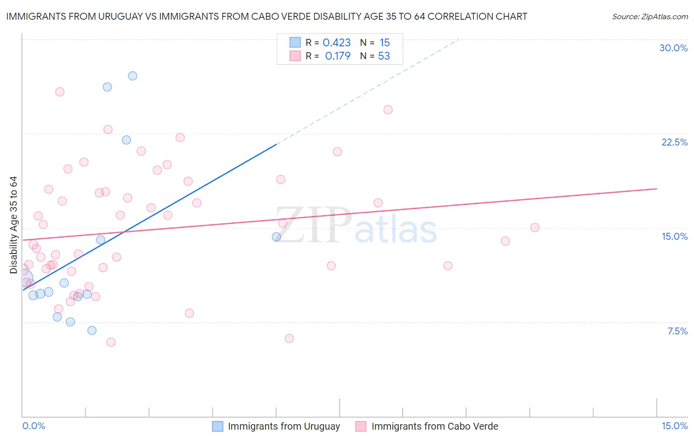 Immigrants from Uruguay vs Immigrants from Cabo Verde Disability Age 35 to 64 Correlation Chart