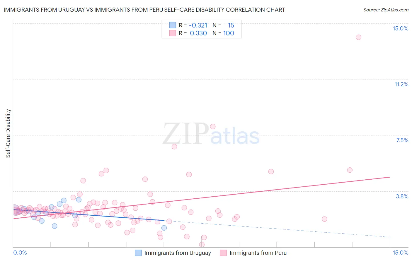 Immigrants from Uruguay vs Immigrants from Peru Self-Care Disability Correlation Chart