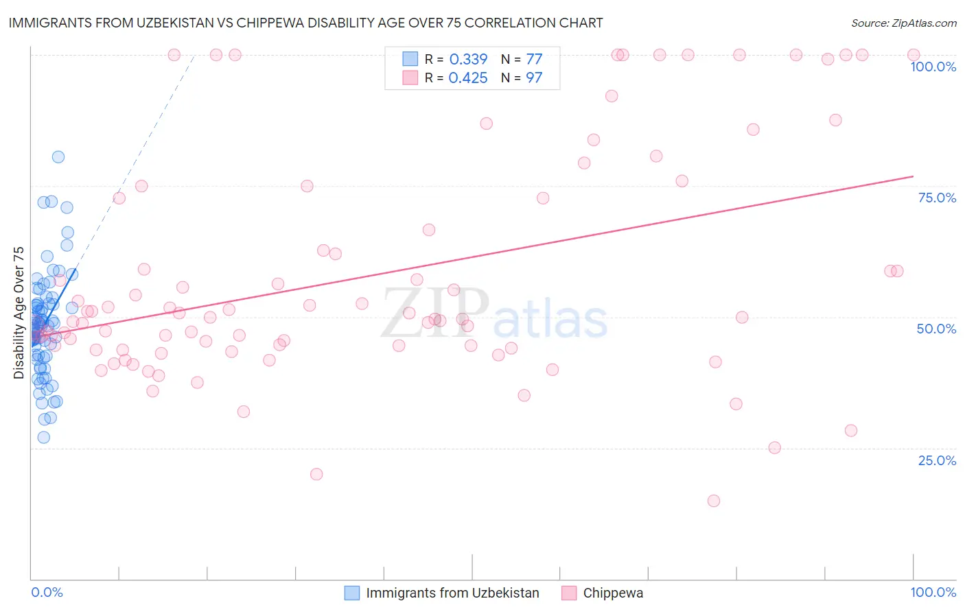 Immigrants from Uzbekistan vs Chippewa Disability Age Over 75 Correlation Chart