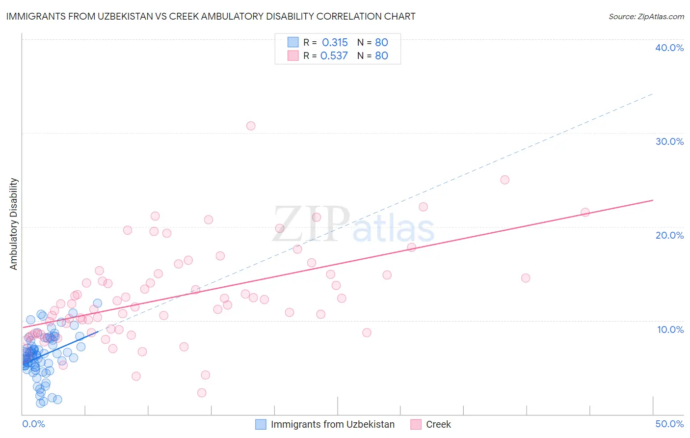 Immigrants from Uzbekistan vs Creek Ambulatory Disability Correlation Chart