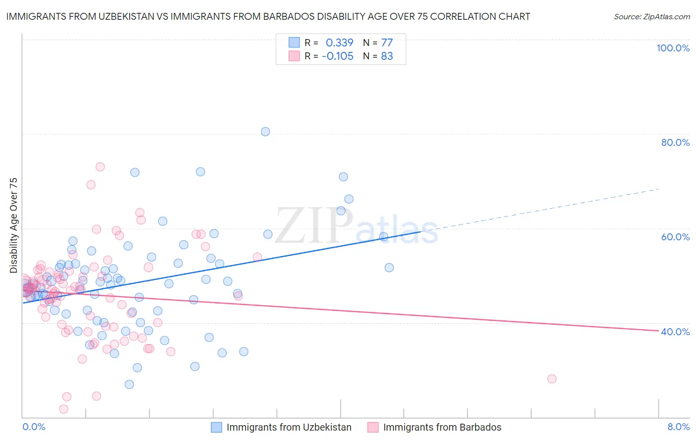 Immigrants from Uzbekistan vs Immigrants from Barbados Disability Age Over 75 Correlation Chart