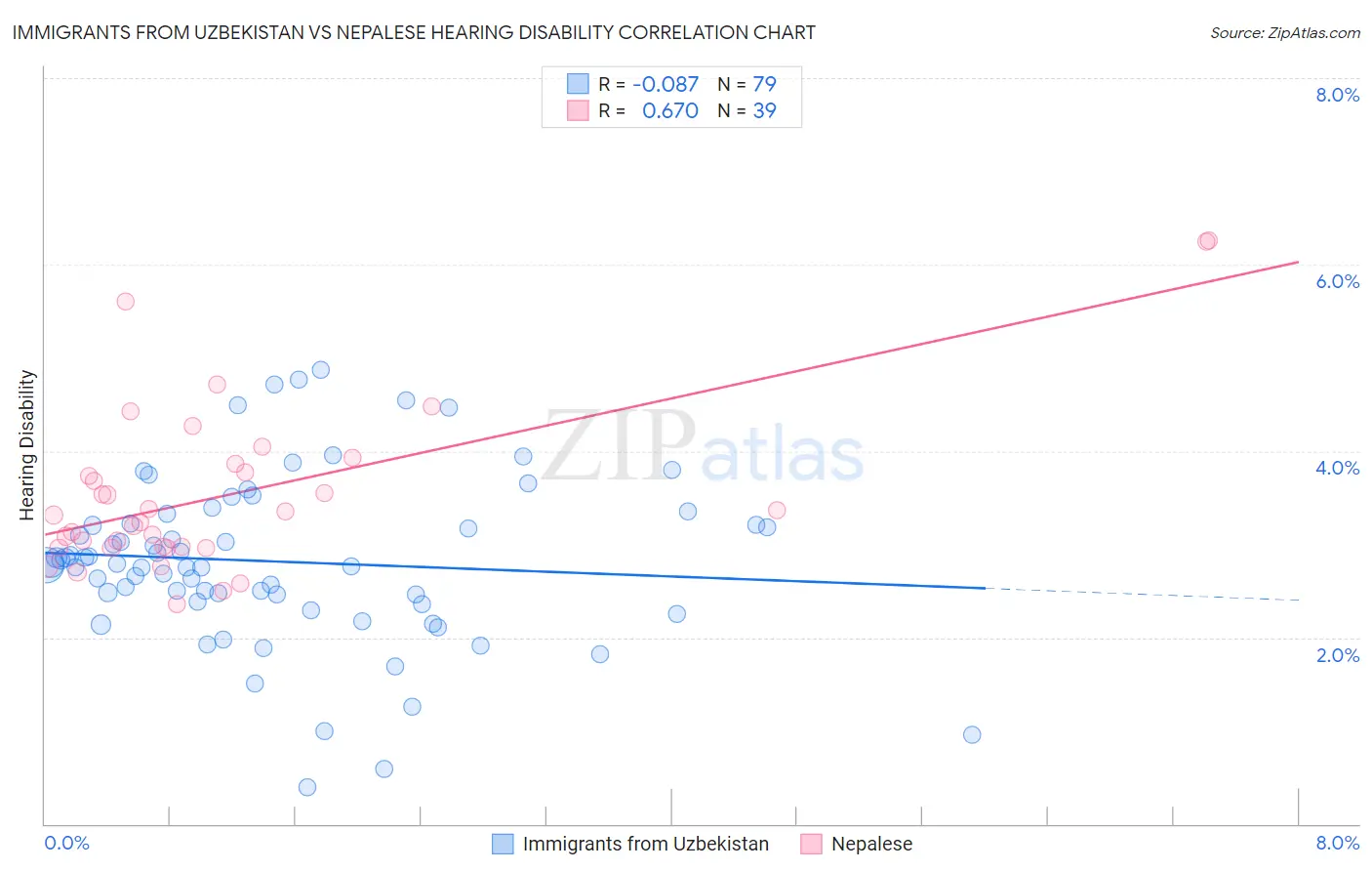 Immigrants from Uzbekistan vs Nepalese Hearing Disability Correlation Chart