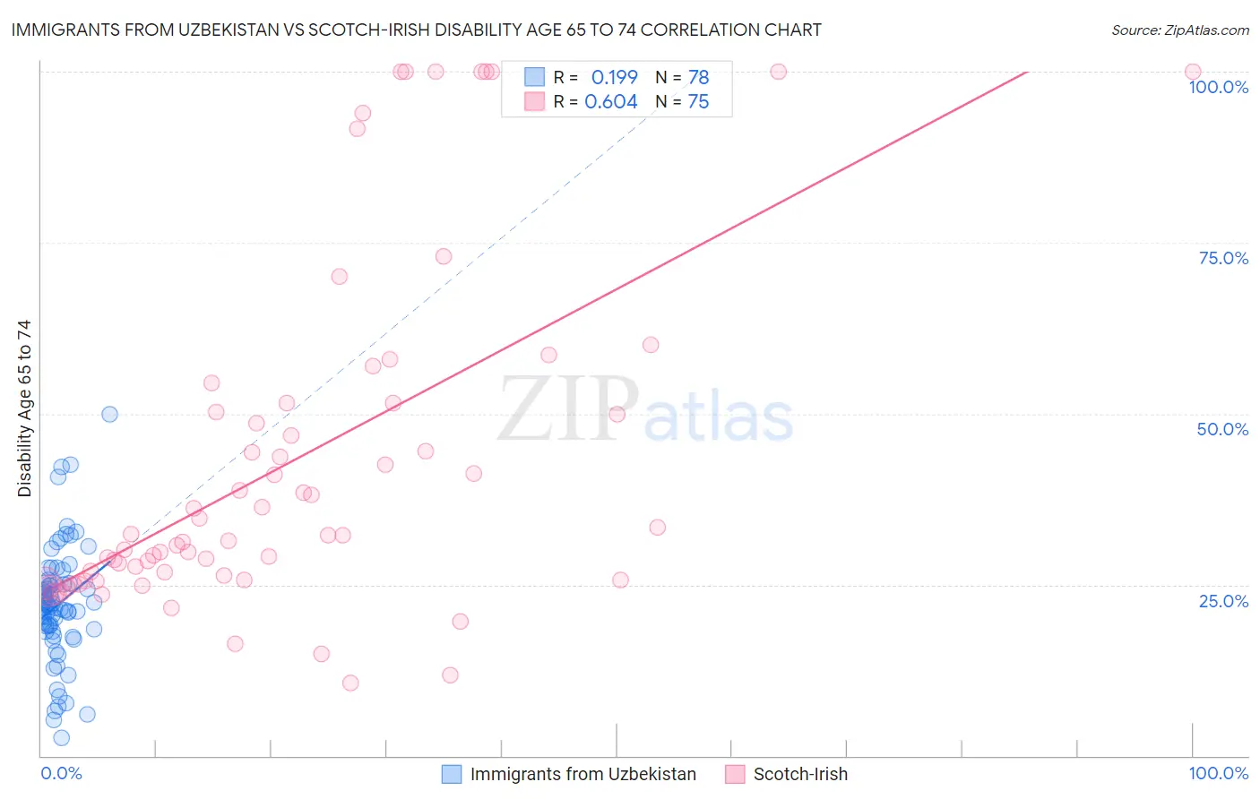 Immigrants from Uzbekistan vs Scotch-Irish Disability Age 65 to 74 Correlation Chart