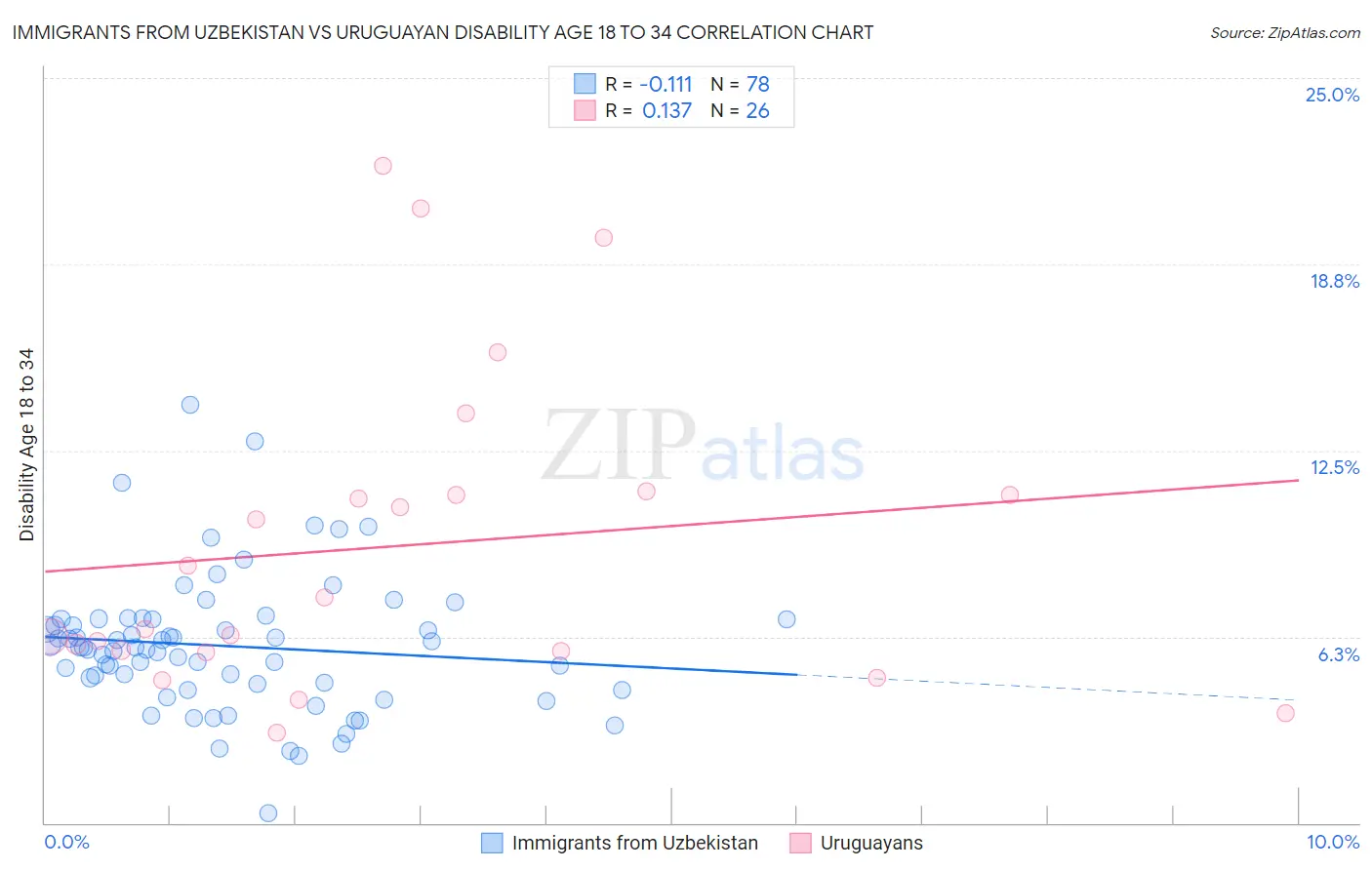 Immigrants from Uzbekistan vs Uruguayan Disability Age 18 to 34 Correlation Chart