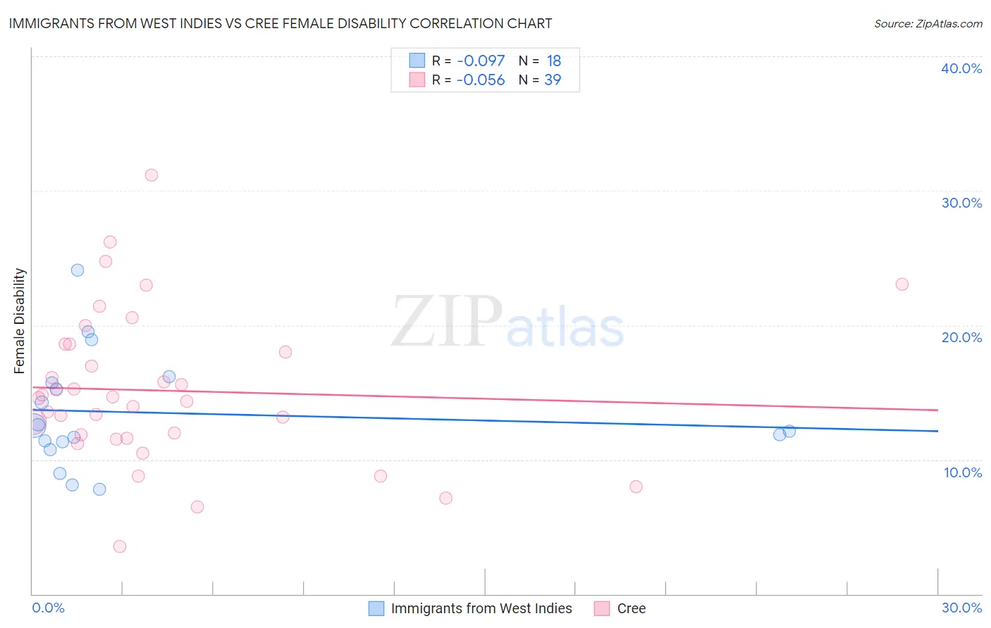 Immigrants from West Indies vs Cree Female Disability Correlation Chart