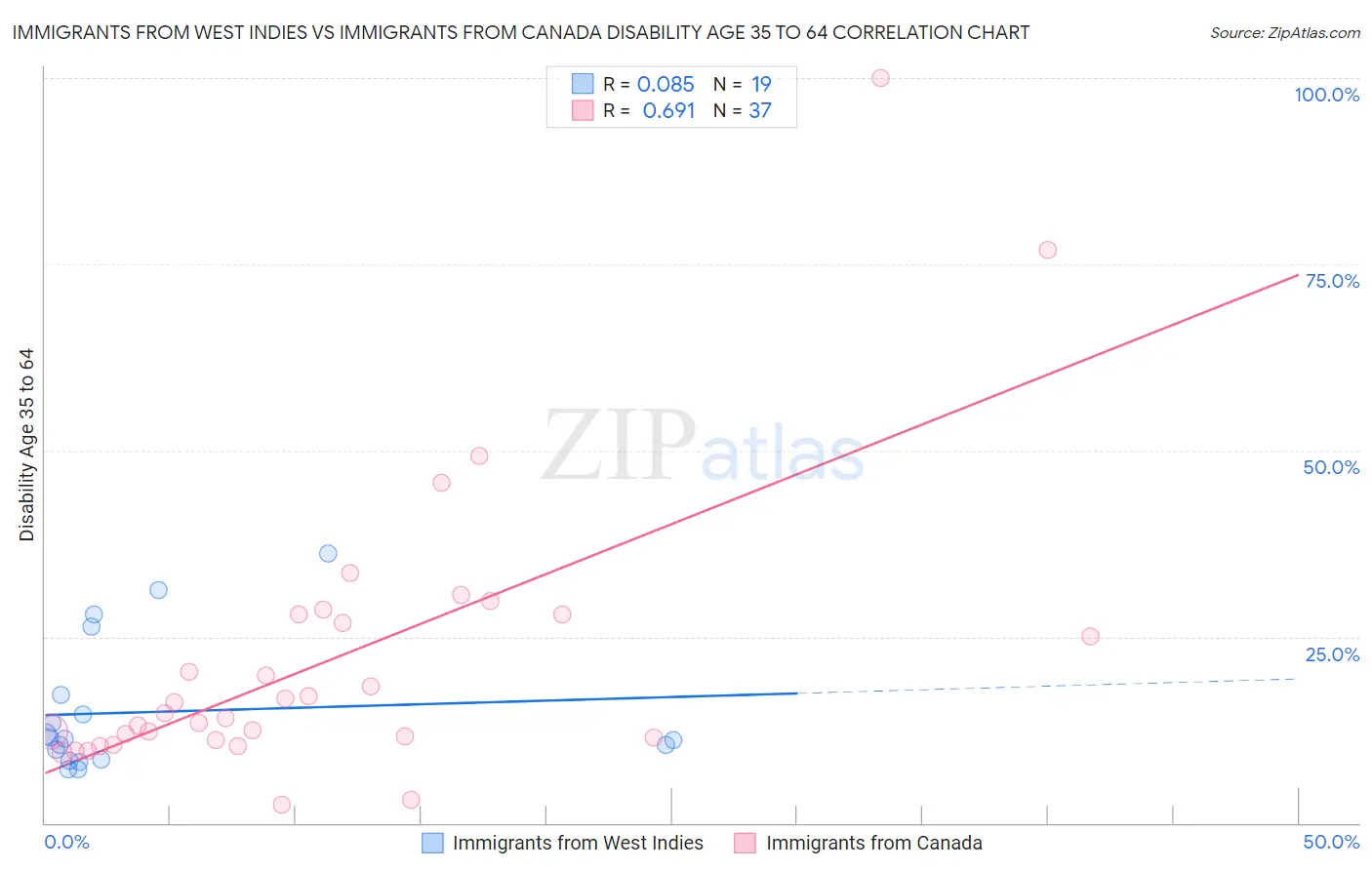 Immigrants from West Indies vs Immigrants from Canada Disability Age 35 to 64 Correlation Chart