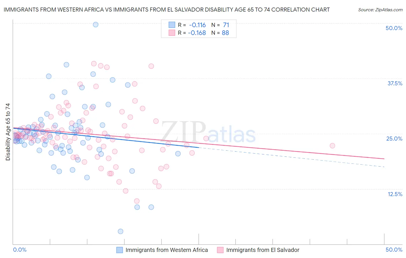 Immigrants from Western Africa vs Immigrants from El Salvador Disability Age 65 to 74 Correlation Chart