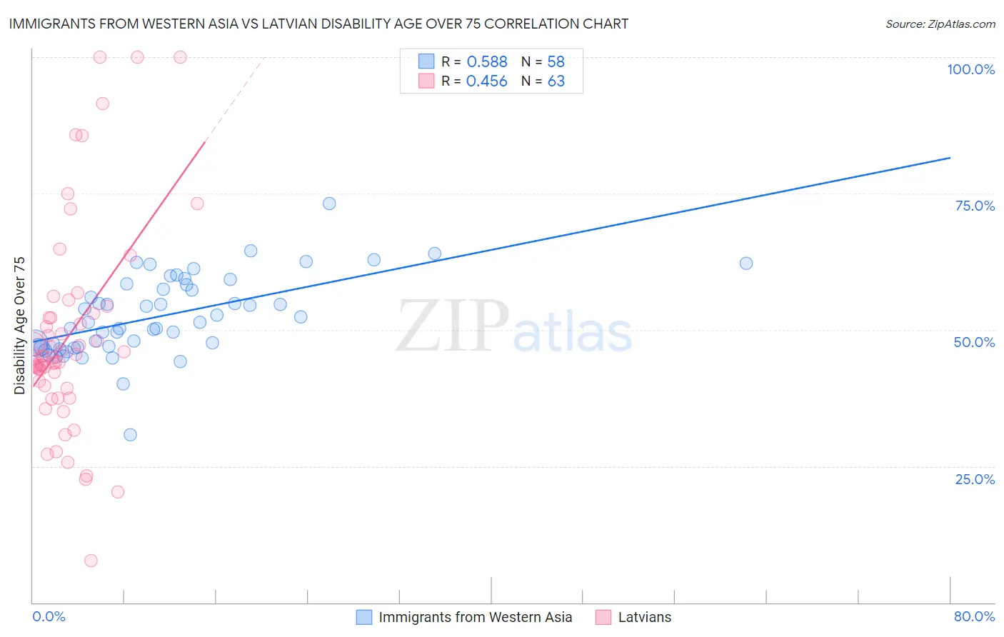 Immigrants from Western Asia vs Latvian Disability Age Over 75 Correlation Chart