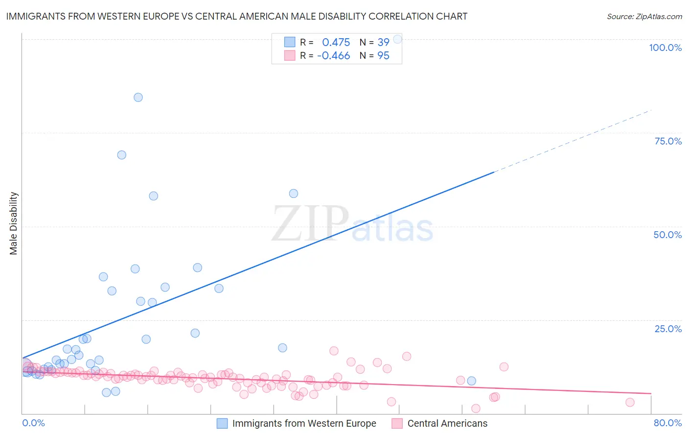 Immigrants from Western Europe vs Central American Male Disability Correlation Chart