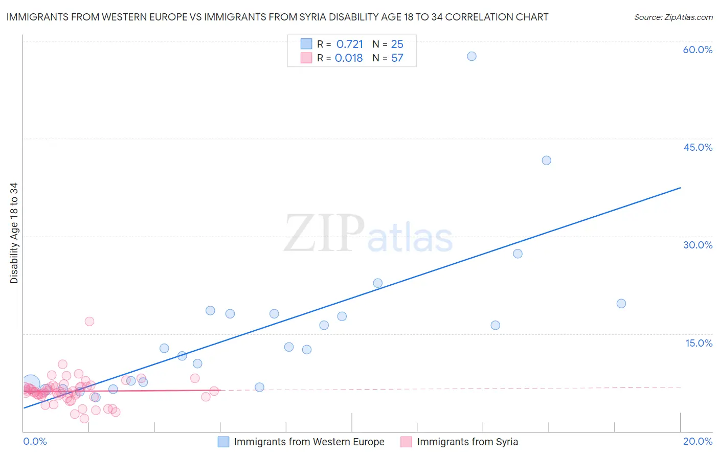 Immigrants from Western Europe vs Immigrants from Syria Disability Age 18 to 34 Correlation Chart