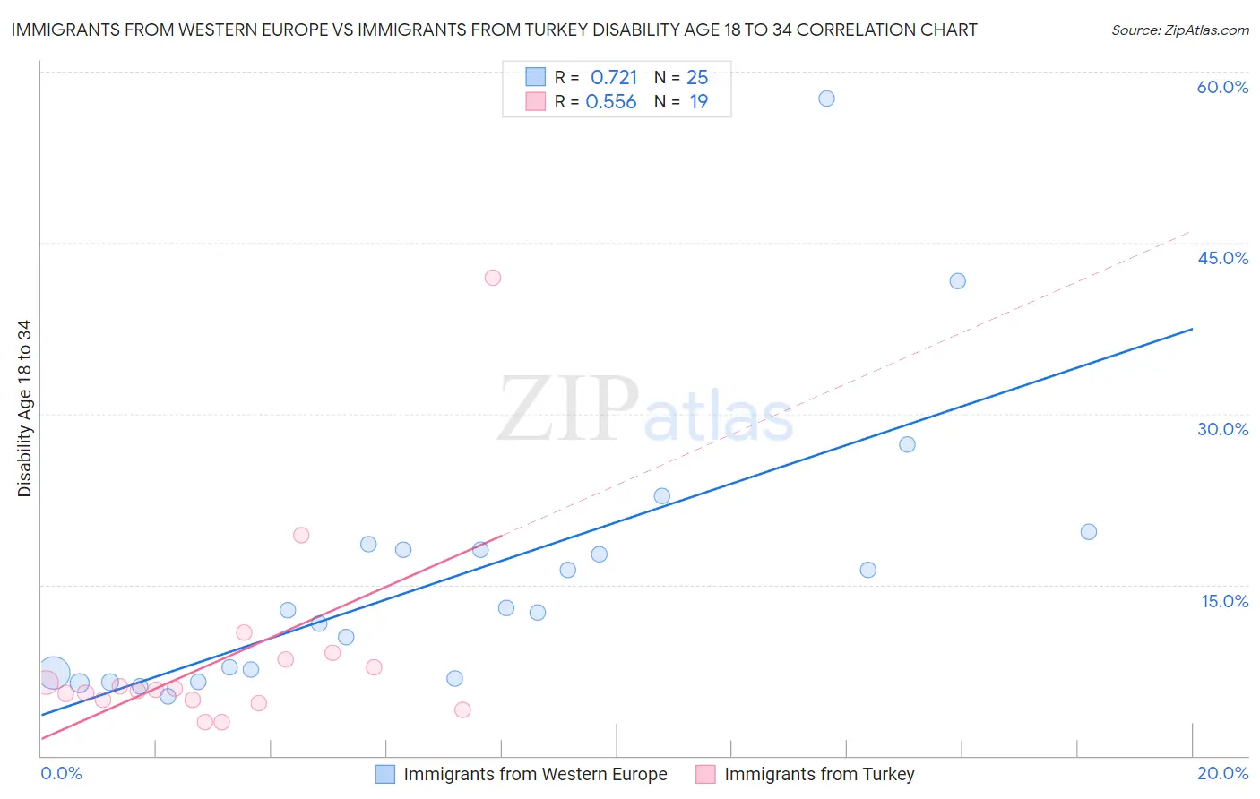 Immigrants from Western Europe vs Immigrants from Turkey Disability Age 18 to 34 Correlation Chart