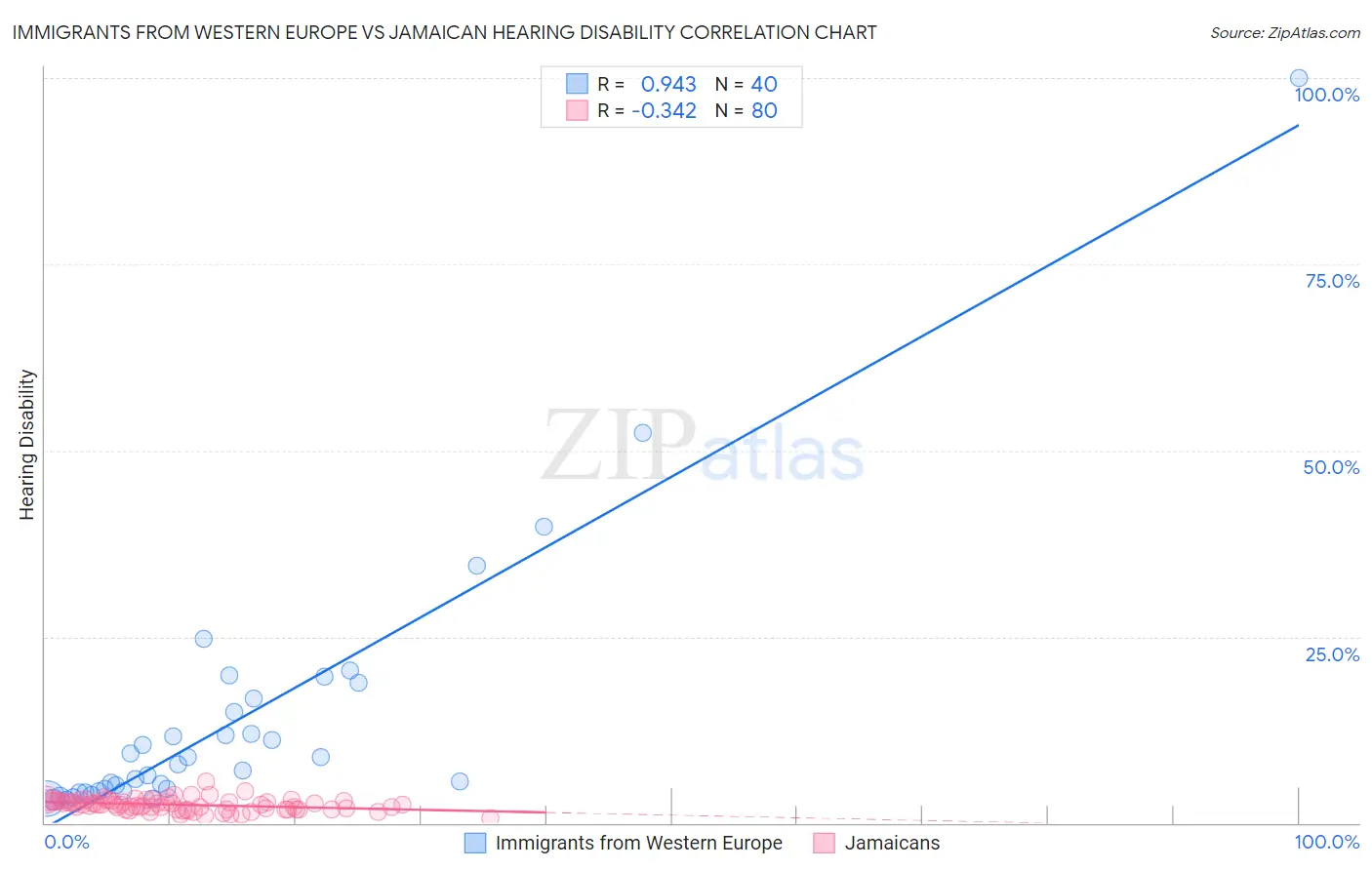 Immigrants from Western Europe vs Jamaican Hearing Disability Correlation Chart