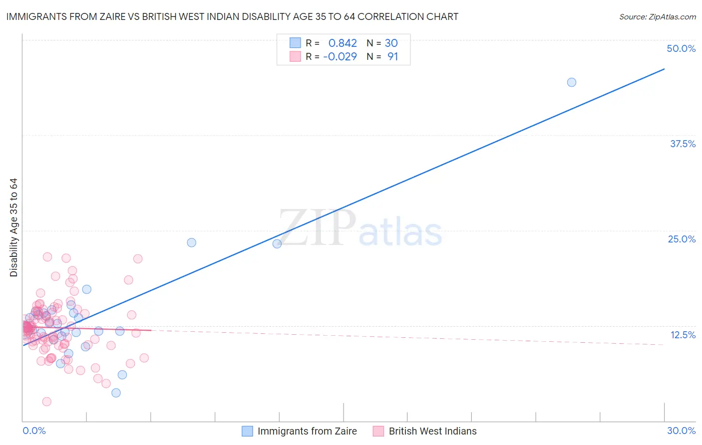 Immigrants from Zaire vs British West Indian Disability Age 35 to 64 Correlation Chart